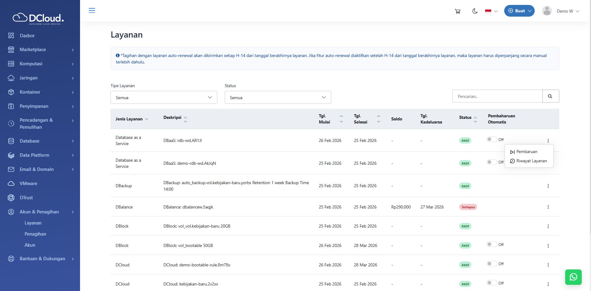 - Buka menu Akun & Penagihan dan pilih sub-menu Layanan, hingga muncul tampilan seperti berikut: