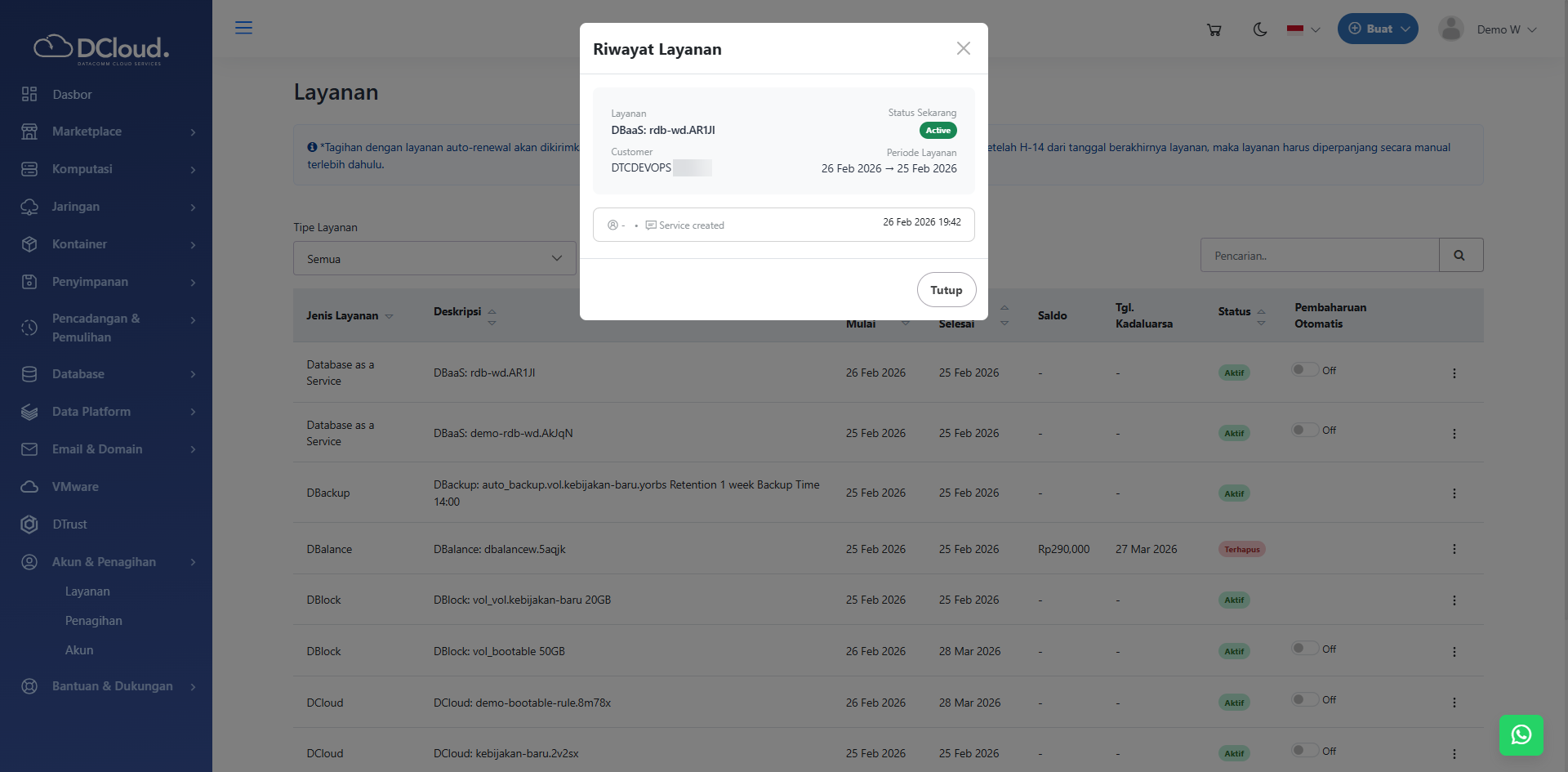 Riwayat layanan memungkinkan pengguna untuk melihat riwayat setiap layanan seperti informasi periode layanan, tanggal dibuat dan status layanan. Untuk melihat riwayat layanan, silakan lakukan langkah-langkah berikut: