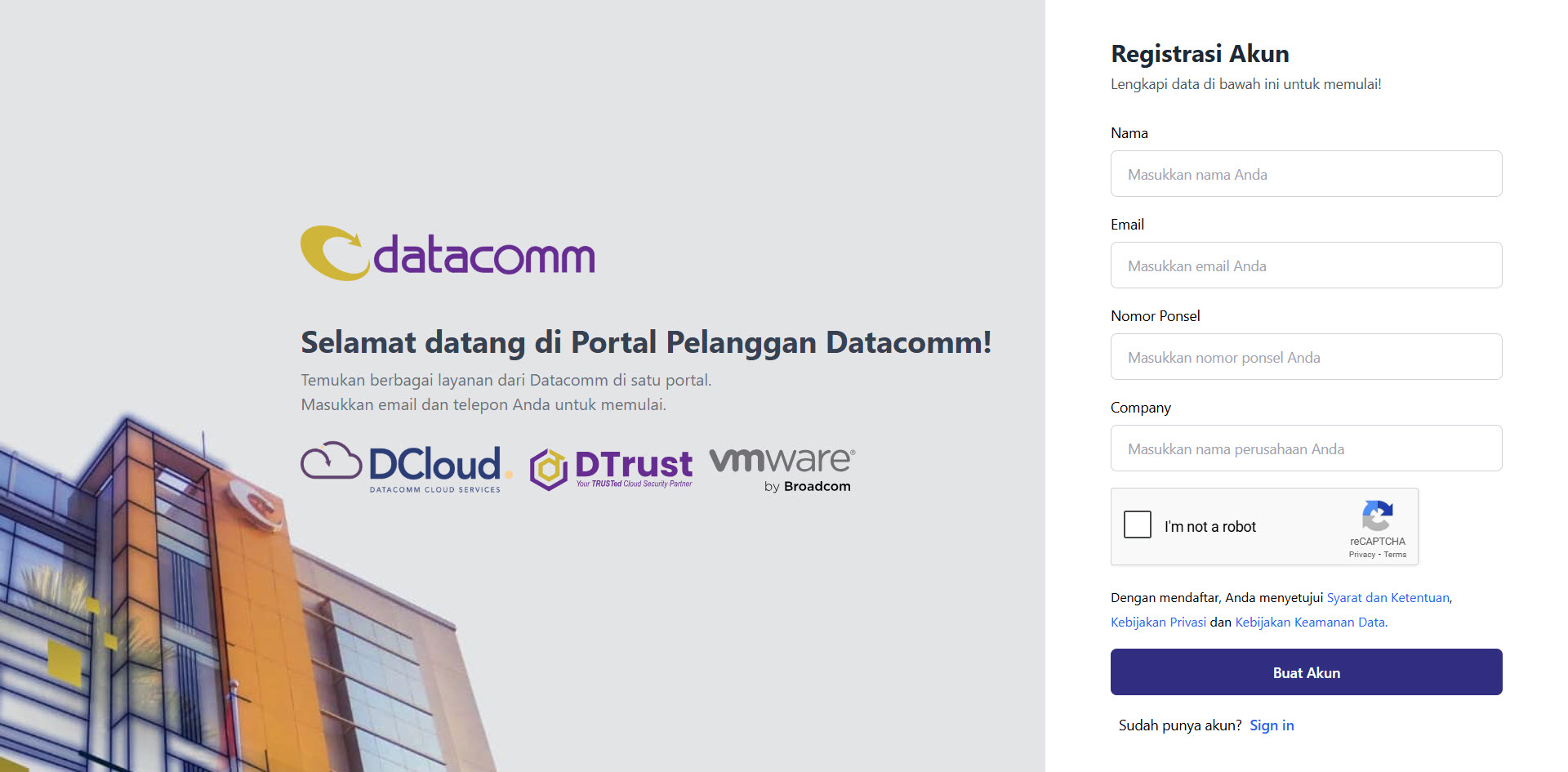 Untuk dapat mengakses dan menggunakan berbagai layanan di Customer Portal DCloud, Anda diwajibkan untuk melakukan registrasi akun terlebih dahulu menggunakan alamat email aktif, yang kemudian diikuti dengan proses verifikasi.
