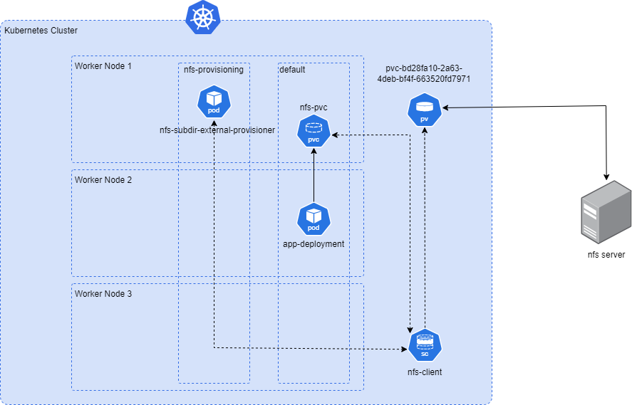 Konfigurasi Dynamic NFS Provisioning di Kubernetes Cluster merupakan proses pengaturan agar kubernetes secara otomatis dapat menyediakan penyimpanan persisten (persistent volume) dari sebuah server NFS (Network File System). Ini memungkinkan pod-pod di dalam cluster Kubernetes untuk mengakses file secara bersama-sama, seolah-olah mereka berada di mesin yang sama.