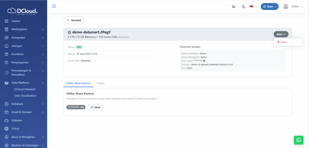 Hapus digunakan untuk menghapus layanan DCloud Datamart yang tidak lagi digunakan. Untuk menghapus DCloud Datamart dapat dilakukan dengan opsi melalui detail layanan. Lakukan langkah di bawah ini jika ingin menghapus DCloud Datamart melalui detail layanan.