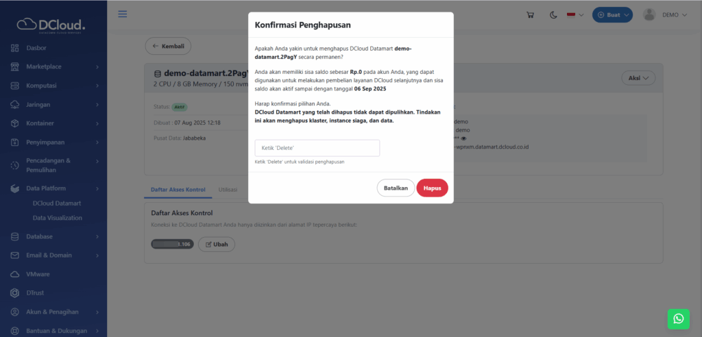 - Sebagai catatan apabila layanan pengguna dihapus, maka pengguna akan mendapatkan sisa saldo yang bisa digunakan untuk melakukan pembelian layanan DCloud yang lain.