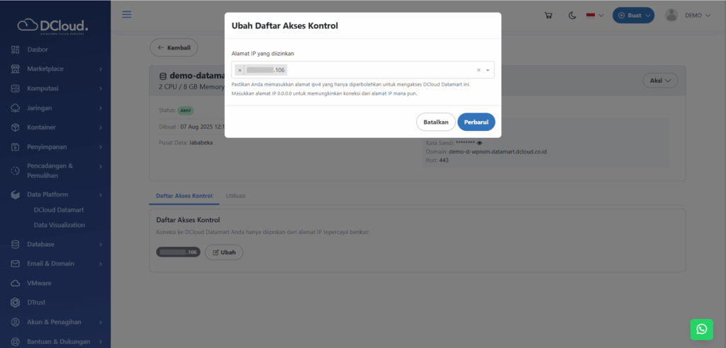 Daftar akses control digunakan untuk mengelola daftar akses kontrol atau IP yang dapat mengakses DCloud Datamart. Untuk mengubah daftar akses kontrol, silakan lakukan langkah-langkah berikut: