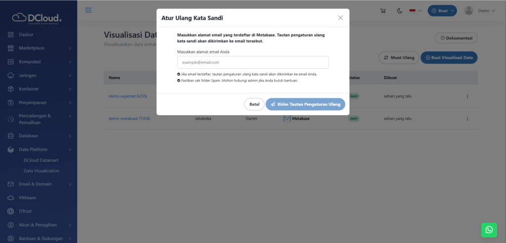 Atur ulang kata sandi digunakan untuk memperbarui kata sandi agar selaras dengan kebutuhan operasional atau keamanan yang berlaku. Untuk Atur ulang kata sandi pada layanan berplatform Metabase, silakan lakukan langkah-langkah berikut: