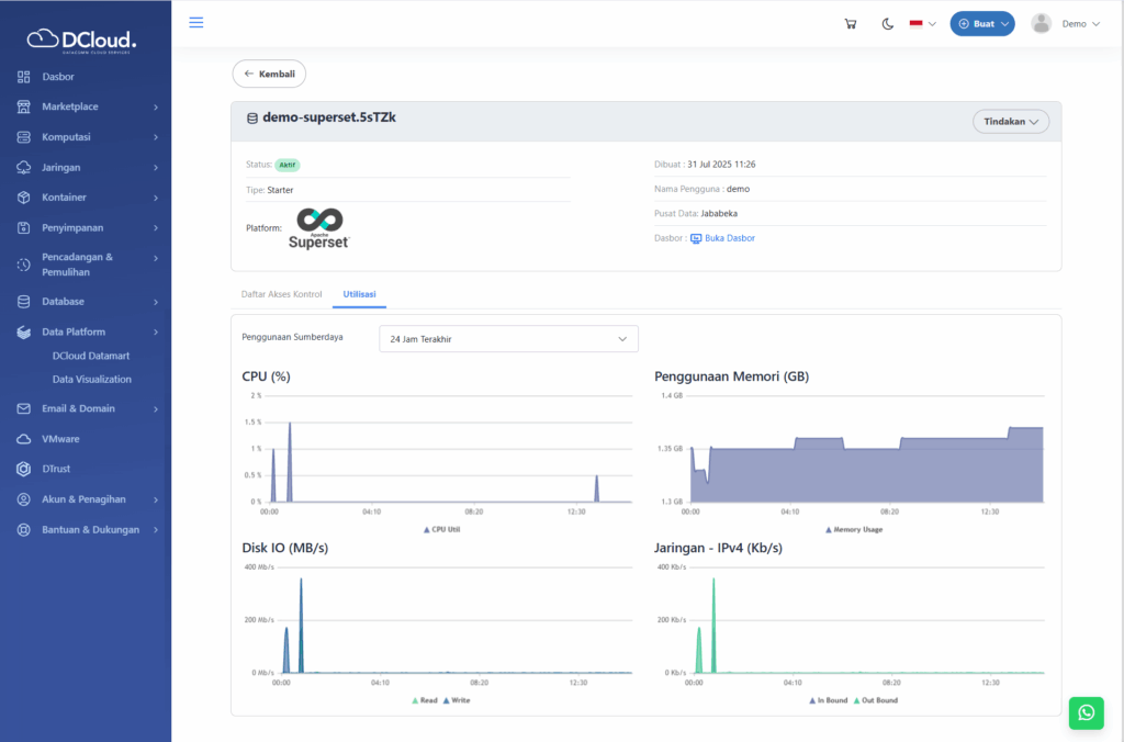 Utilisasi menyediakan data analitik mengenai kinerja Data Visualization mencakup penggunaan CPU, Memori, Disk IO dan Jaringan IPv4. Untuk melihat utilisasi Data Visualization, silakan lakukan langkah-langkah berikut: