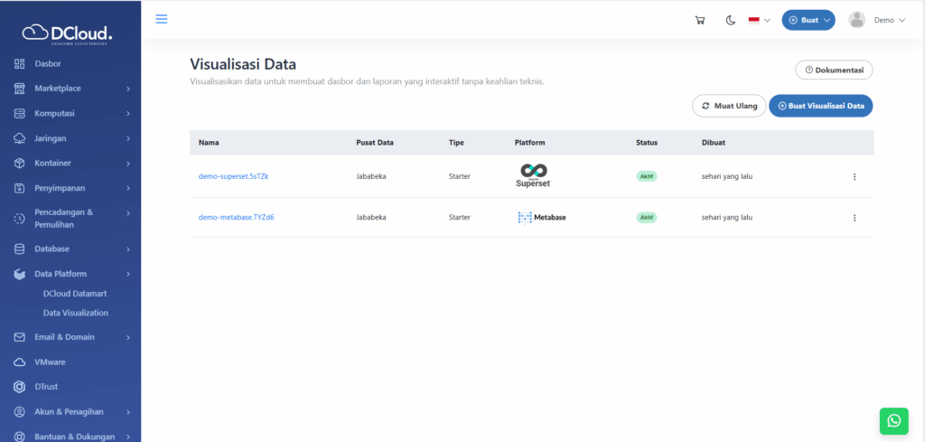 Muat Ulang digunakan untuk menyegarkan tampilan halaman Data Visualization. Fitur ini berguna ketika informasi layanan yang baru dibeli atau diubah belum termutakhirkan pada halaman. Untuk menyegarkan halaman dapat menekan tombol Muat Ulang pada sub-menu Data Visualization.