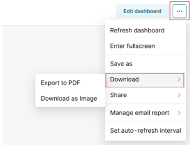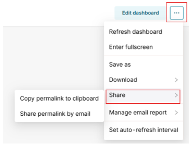 Gambar 73 Halaman Share - Ekspor Laporan: Buka menu Dashboard, pilih icon titik tiga pada pojok kanan atas, kemudian pilih Download dashboard dalam bentuk PDF atau gambar untuk dibagikan secara offline.