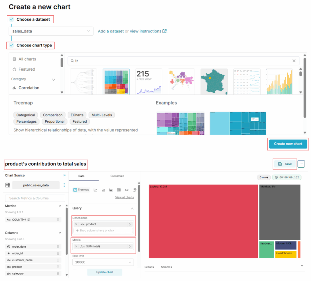Treemap Chart: Menunjukkan kontribusi tiap produk terhadap total penjualan, dengan contoh data sebagai berikut: