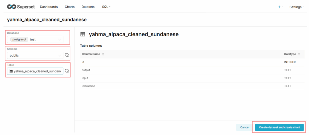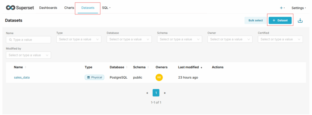 Dataset adalah sumber data yang digunakan untuk membuat visualisasi dan chart di Superset. Dataset berfungsi sebagai jembatan antara tabel di database dengan fitur visualisasi di Superset. Dengan membuat dataset, Anda dapat dengan mudah memilih kolom, melakukan agregasi data, dan membuat filter tanpa menulis SQL secara manual. Untuk membuat Dataset, silakan ikuti langkah-langkah di bawah ini: