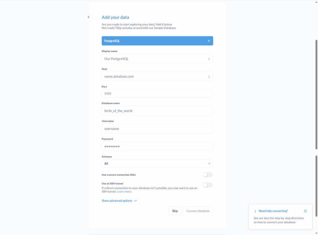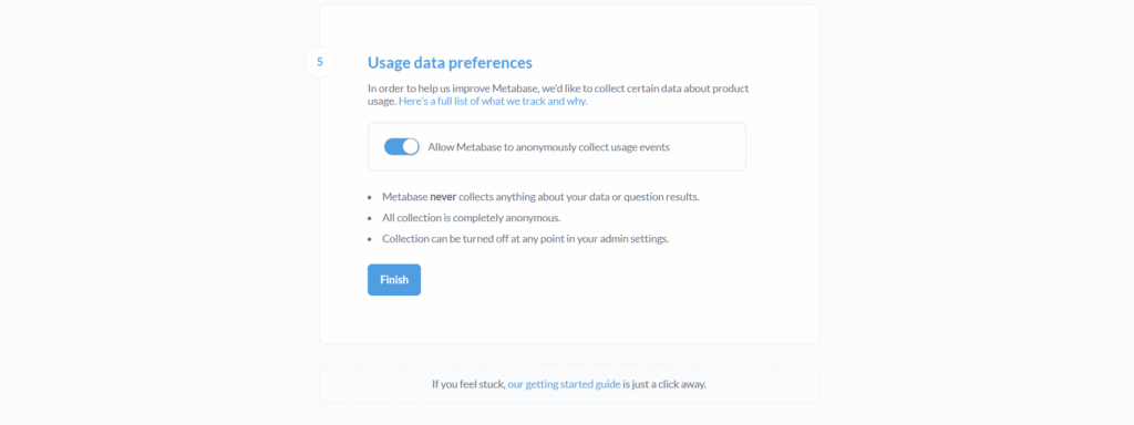 - Pada tahap akhir, tinjau kembali semua pengaturan yang telah Anda buat, kemudian klik tombol Finish. Setelah itu, Anda akan diarahkan langsung ke halaman utama Metabase.