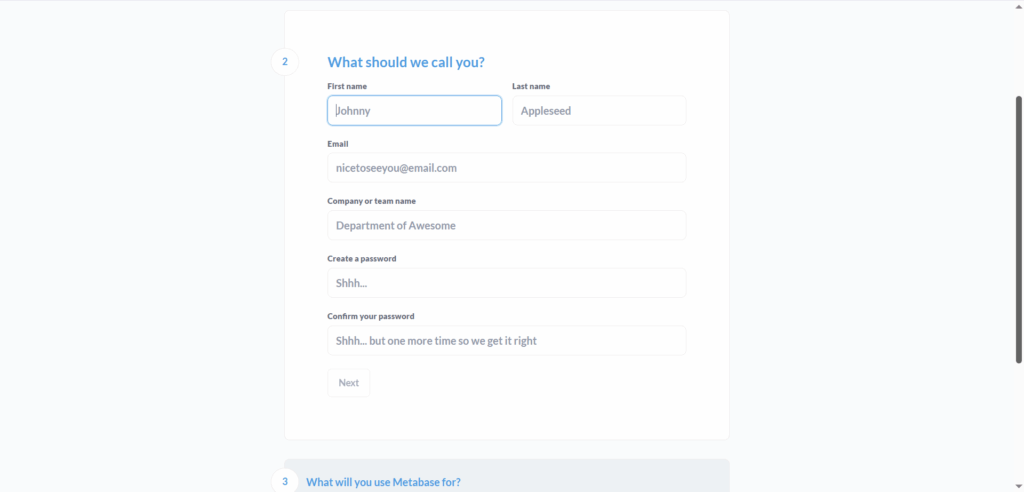 Gambar 77 Halaman Buat Akun - Setelah seluruh data terisi, tekan tombol Next. Kemudian, akan muncul halaman di mana Anda dapat memilih opsi penggunaan Metabase. Silakan sesuaikan pilihan tersebut dengan kebutuhan Anda, lalu klik tombol Next.