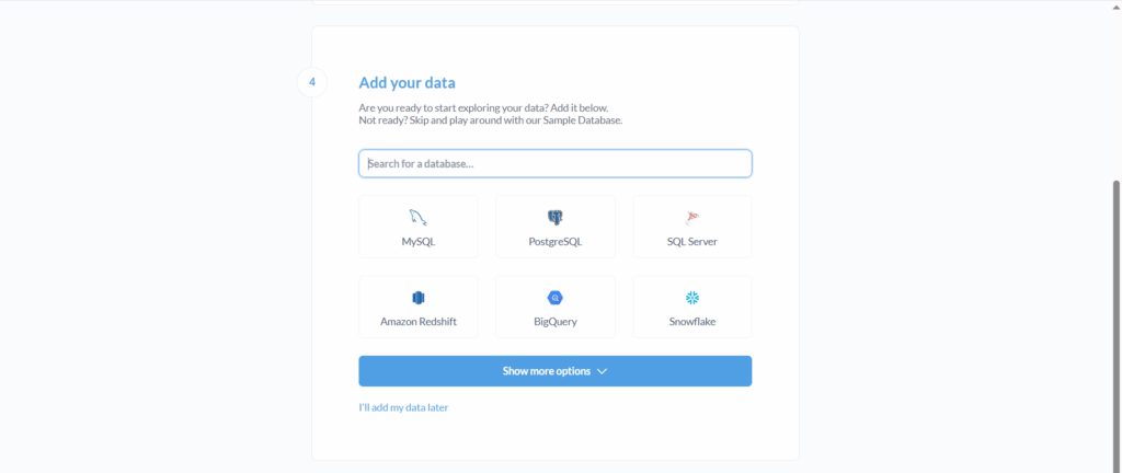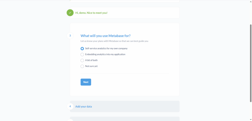 Gambar 78 Halaman Pilihan Penggunaan Metabase - Langkah selanjutnya, menghubungkan database yang Anda miliki agar dapat diakses oleh Metabase. Jika ingin mengatur sumber data ini di lain waktu, Anda bisa melewati langkah ini dengan menekan tombol I’ll add my data later. Sebagai contoh, panduan ini menggunakan DCloud Datamart sebagai sumber data. Berikut adalah langkah-langkahnya: