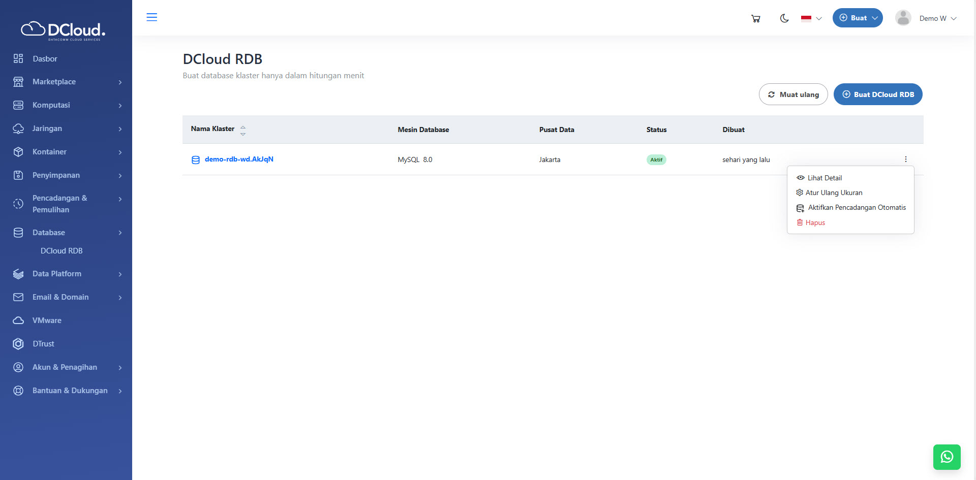 - Buka menu Database dan pilih sub-menu DCloud RDB.