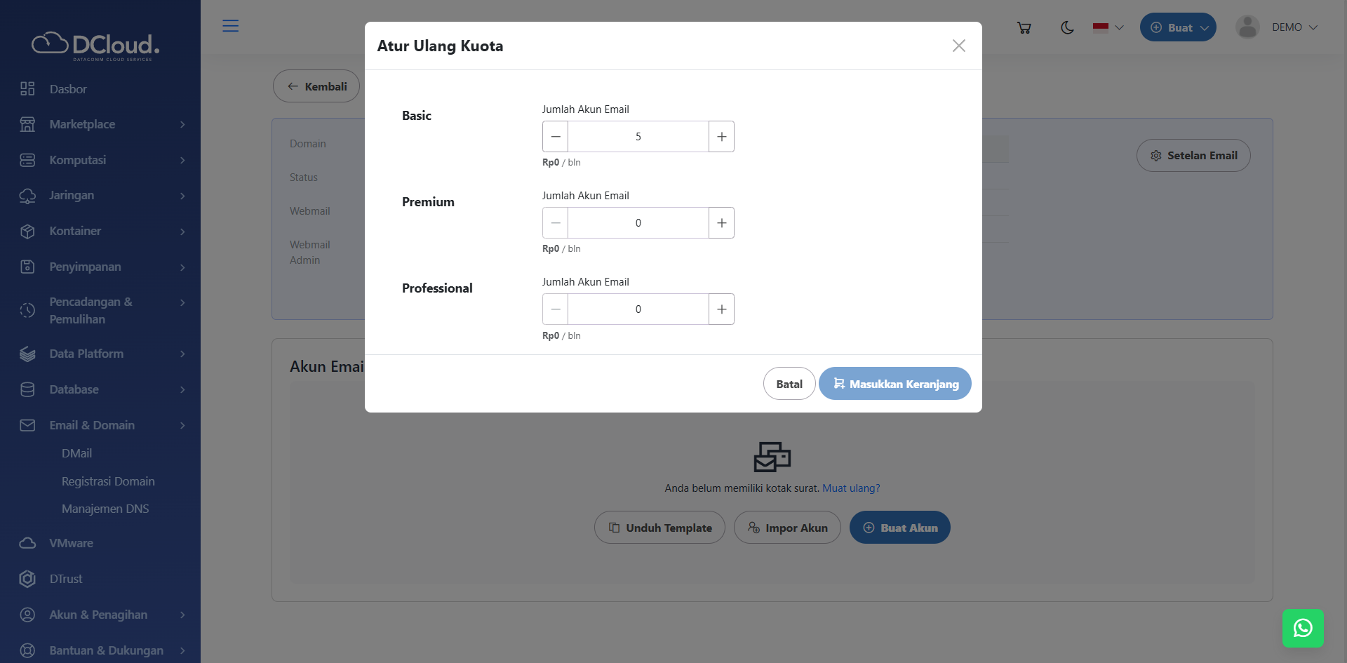 Halaman Atur Ulang Kuota DMail Axigen - Pilih Paket yang sesuai dengan kebutuhan pengguna dari pilihan yang tersedia, yaitu paket Basic, Premium dan Professional.