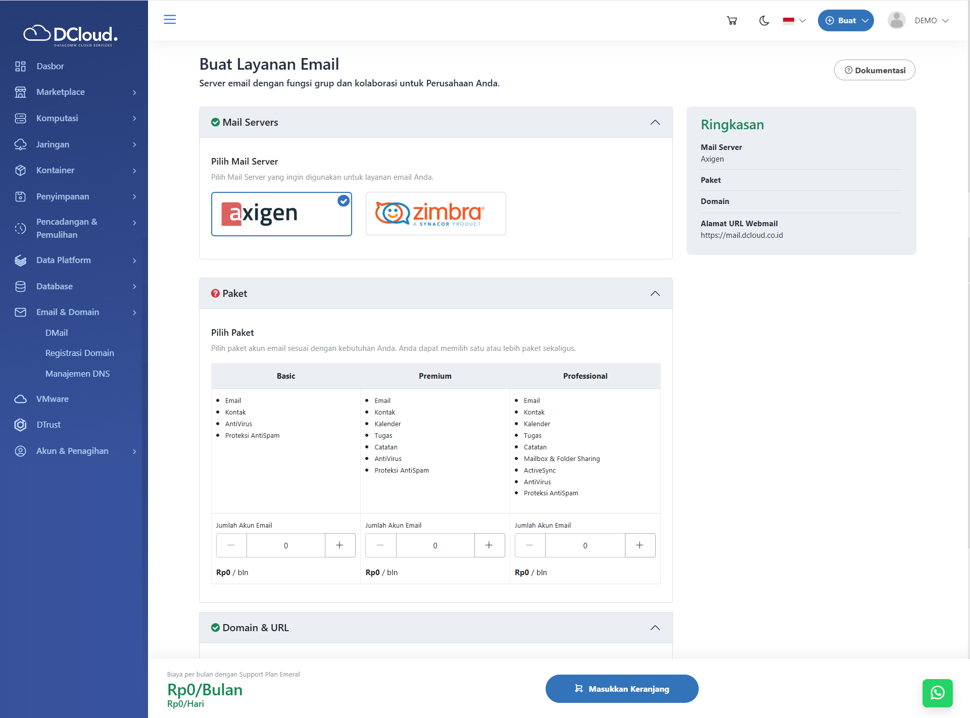 Halaman Dmail Axigen - Pilih Paket yang sesuai dengan kebutuhan pengguna dari pilihan yang tersedia, yaitu paket Basic, Premium dan Professional.