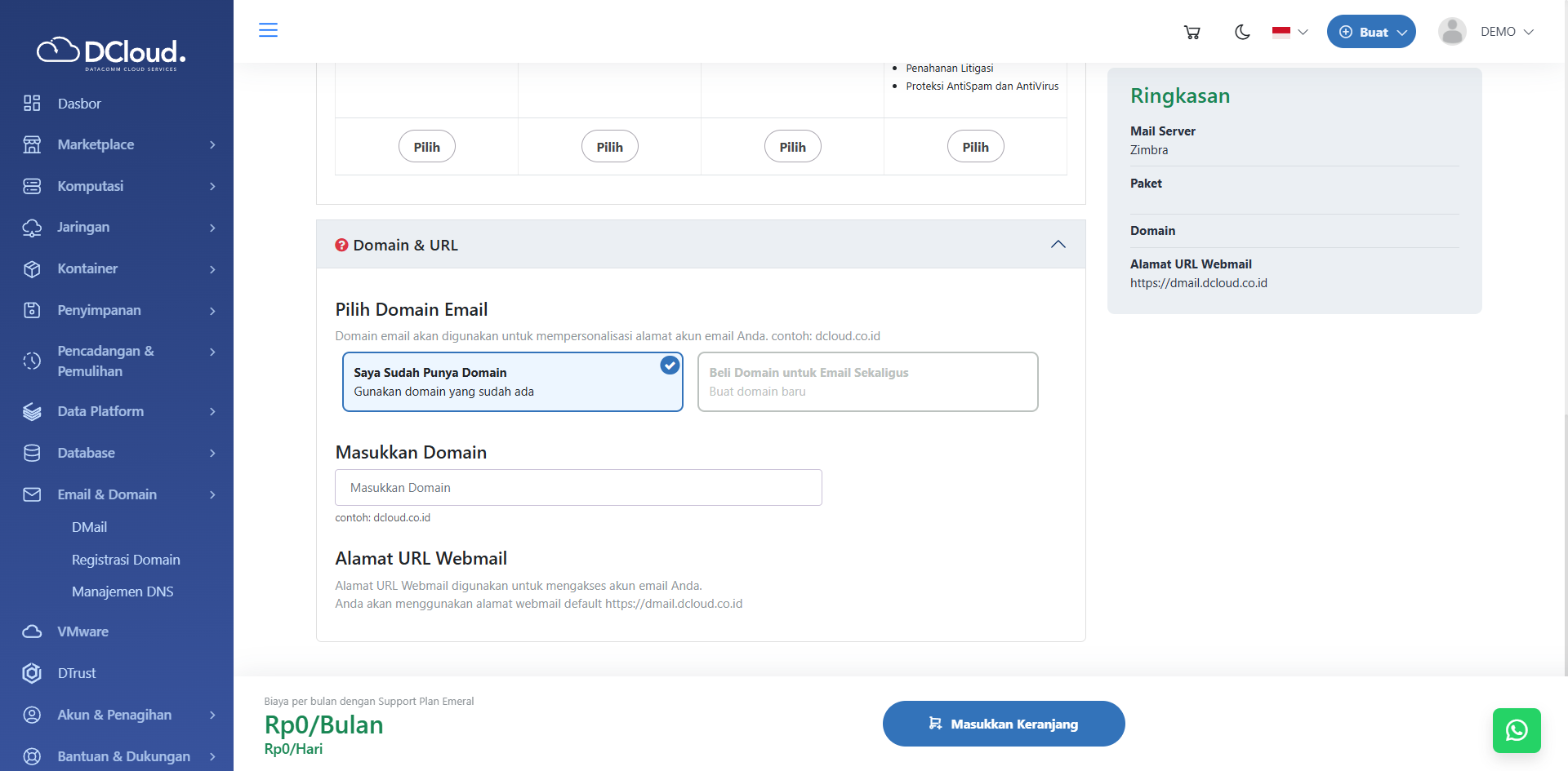 Halaman Buat DMail Zimbra Bagian Domain & URL - Pilih Email Domain yang sesuai dengan kebutuhan pengguna. Pilihan Saya Sudah Punya Domain sebagai pilihan default. Hal ini memungkinkan pengguna yang telah memiliki domain untuk memasukkan nama domain pada kolom Masukkan Domain.