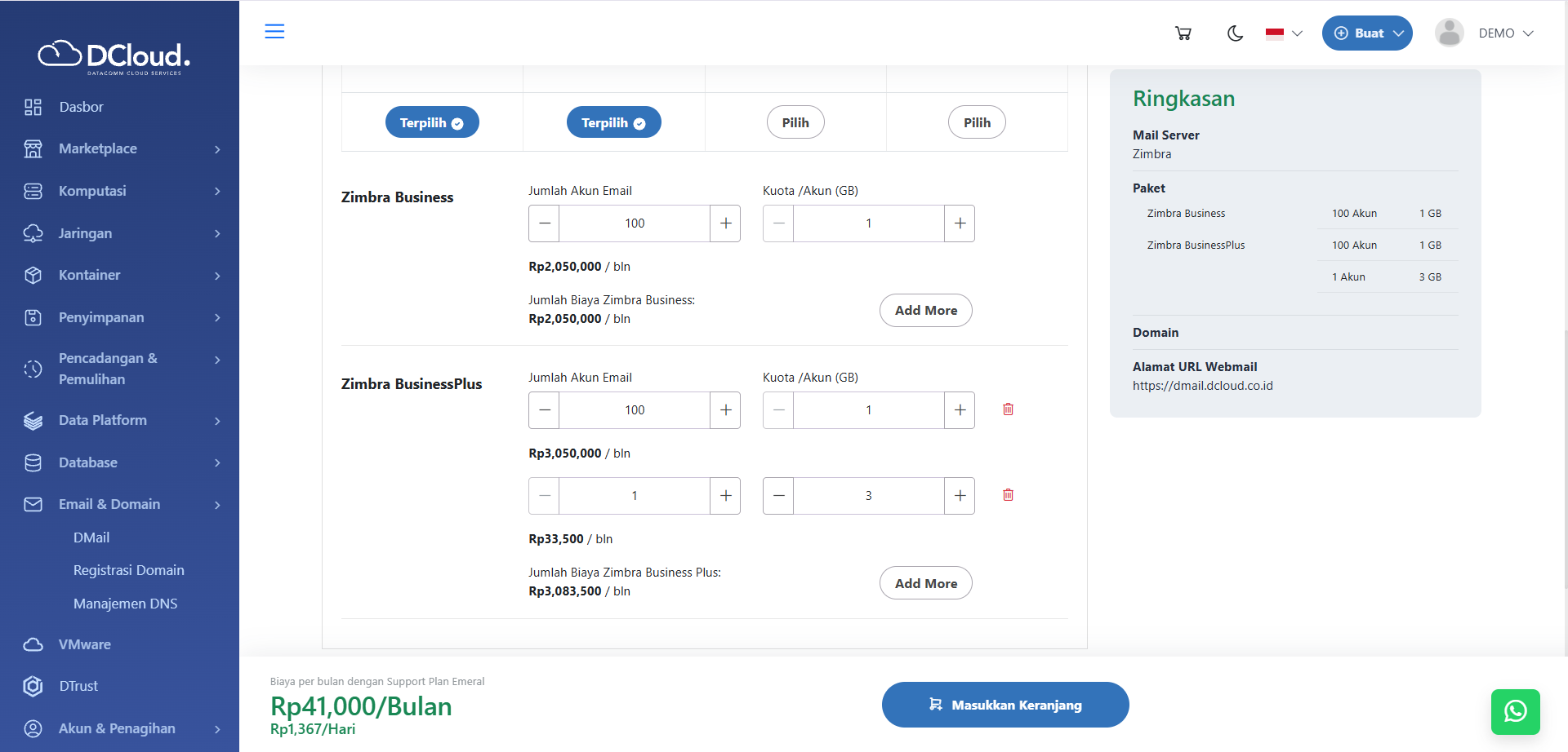 Halaman DMail Zimbra Pilih Paket - Masukkan Jumlah Akun Email dan Kuota per Akun (GB) sesuai kebutuhan, dengan menekan tombol + atau –.