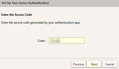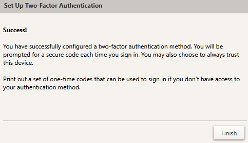 Halaman untuk memasukan kode authenticator - Jika proses telah berhasil, tampilan akan menampilkan informasi Two-Factor Authentication Success. Klik Finish untuk menyelesaikan.