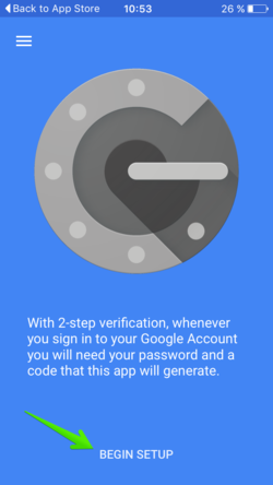 Halaman cari aplikasi authenticator - Setelah aplikasi terpasang, buka aplikasi tersebut dan klik Begin Setup.
