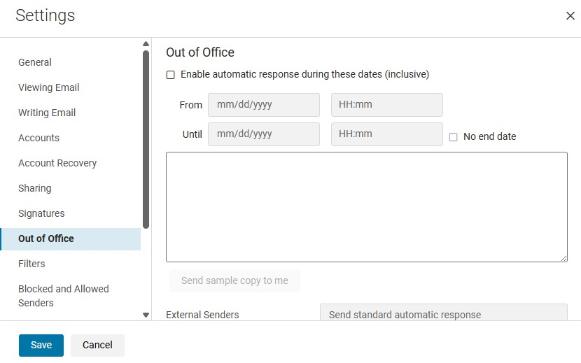 - Klik pada kotak Enable automatic response during these dates (inclusive) untuk mengaktifkan fitur Out of Office.