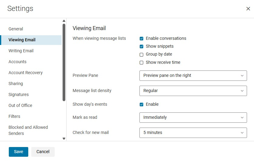 Pengaturan Viewing Email digunakan untuk menyesuaikan bagaimana email ditampilkan, mencakup tampilan percakapan, snippet, preview pane, pengelompokan tanggal, dan perilaku penandaan pesan.