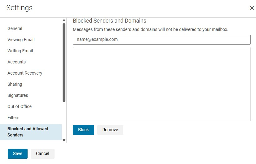 - Pada menu kiri, pilih Blocked and Allowed Senders.