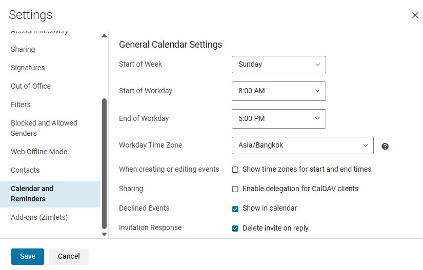 - Sharing: Aktifkan Enable delegation for CalDAV clients jika Anda ingin memberikan akses delegasi kalender kepada pengguna lain melalui aplikasi CalDAV.