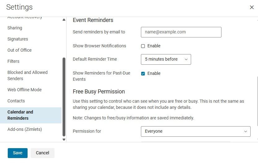 Pengaturan Calendar and Reminders digunakan untuk mengatur preferensi kalender, pengingat acara, serta pengaturan siapa saja yang dapat melihat status waktu luang (free/busy) Anda.