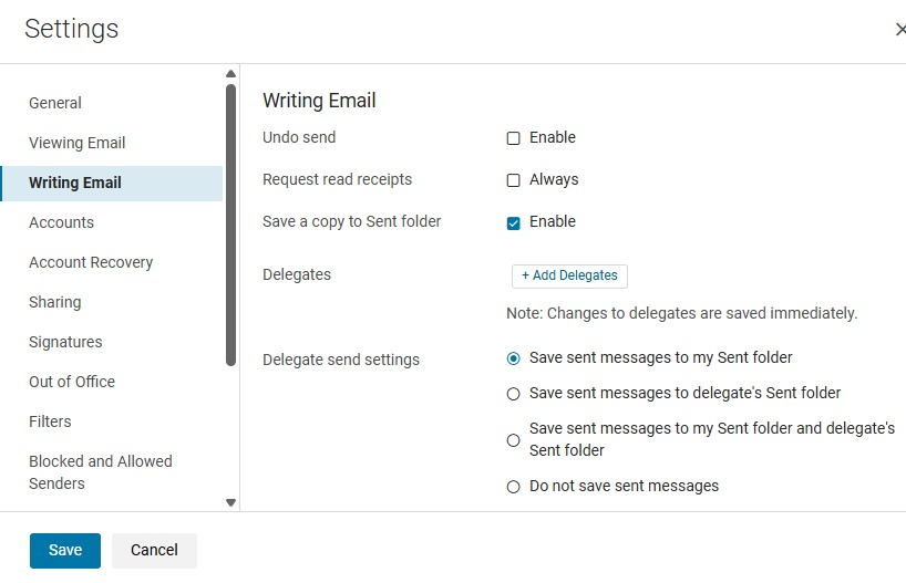 - Delegates Send Settings: Anda juga dapat memilih bagaimana email yang dikirim oleh delegasi ditampilkan.