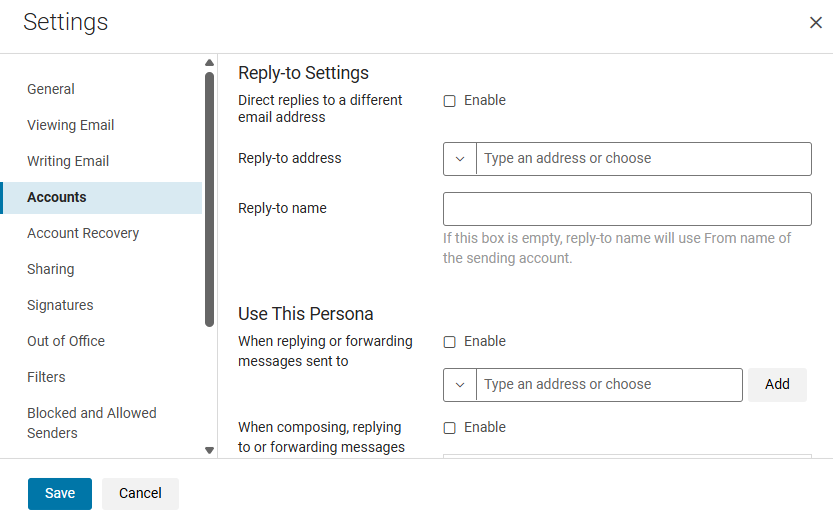 Pengaturan Accounts digunakan untuk mengatur identitas pengiriman email, alias, akun tambahan, serta metode pemulihan akun.