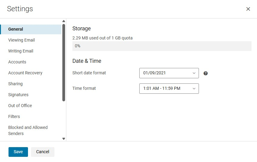 General berisi pengaturan dasar akun Anda, seperti penyimpanan (storage) serta format tanggal dan waktu. Anda dapat menyesuaikan preferensi ini sesuai kebutuhan.