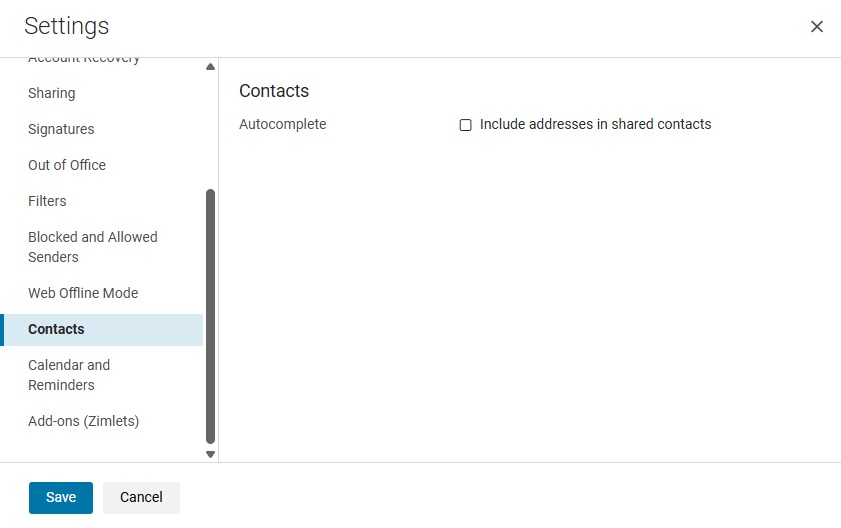 B. Di bagian Autocomplete, klik atau centang kotak Include addresses in shared contacts untuk mengaktifkan fitur ini.- Jika dicentang, sistem akan menampilkan autocomplete dari kontak yang dibagikan kepada Anda (shared contacts).