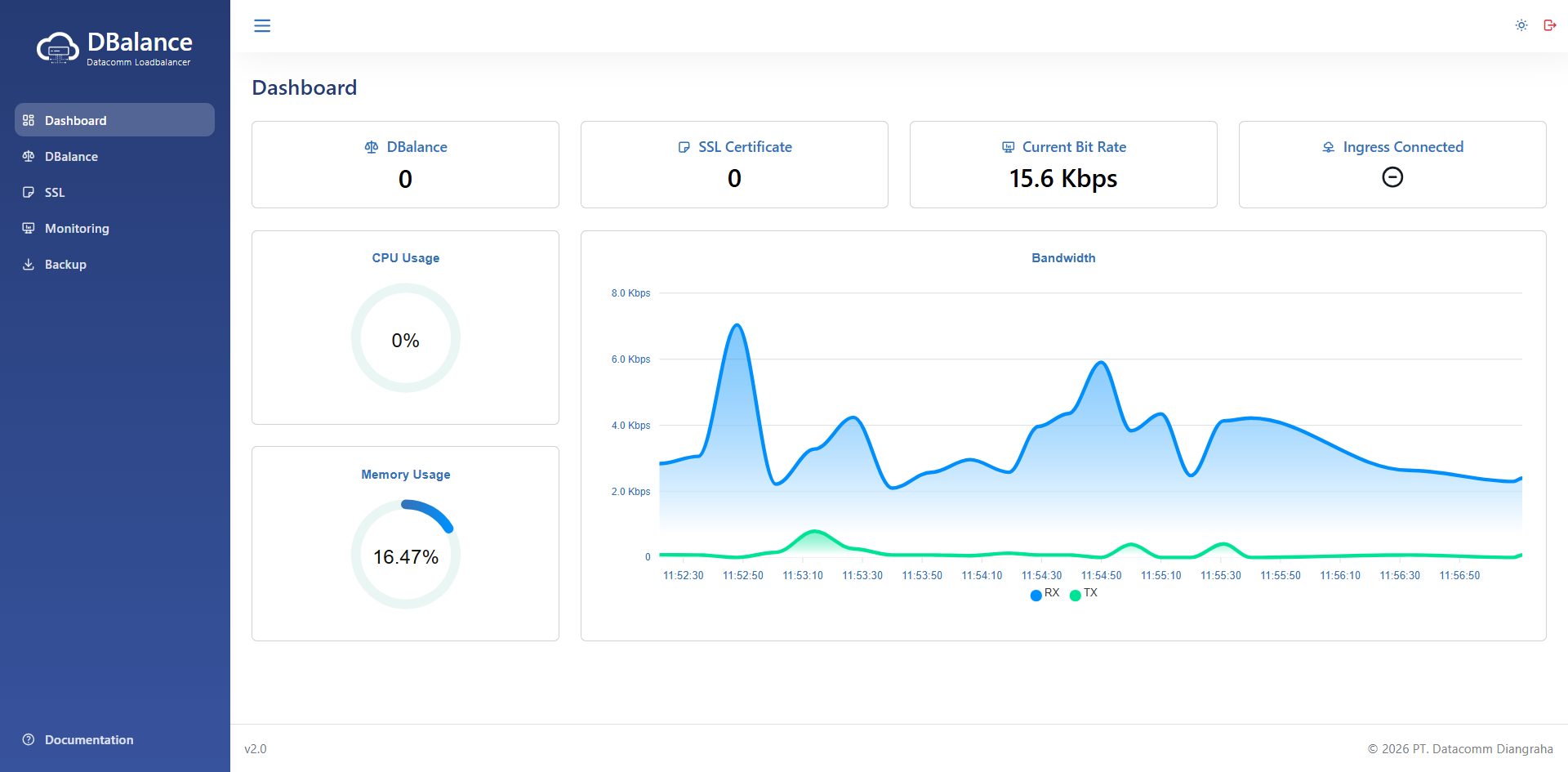 - Panel Sidebar (Navigasi): Merupakan pusat kendali akses yang berisi menu utama, termasuk Dashboard untuk ringkasan kinerja Load Balancer, SSL untuk pengelolaan SSL Certificate, Monitoring untuk memantau performa DBalance, Backup untuk pengelolaan penyimpanan, serta Documentation untuk panduan penggunaan layanan.