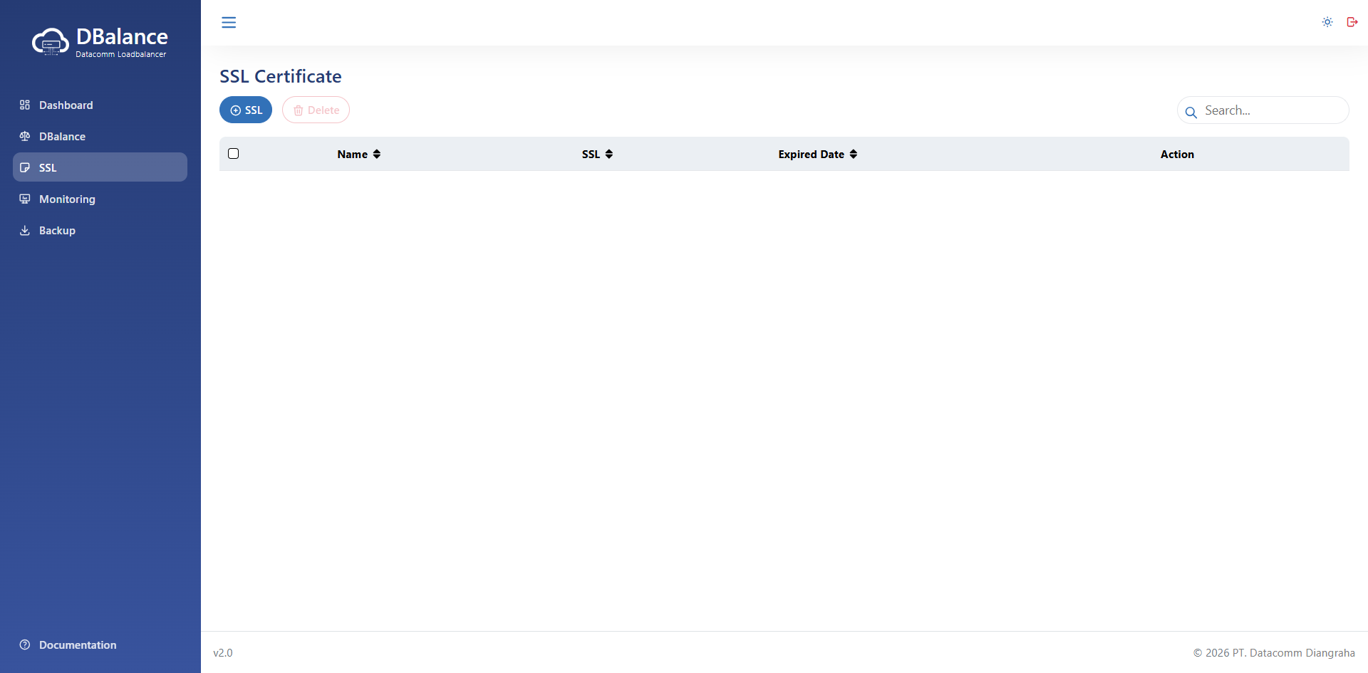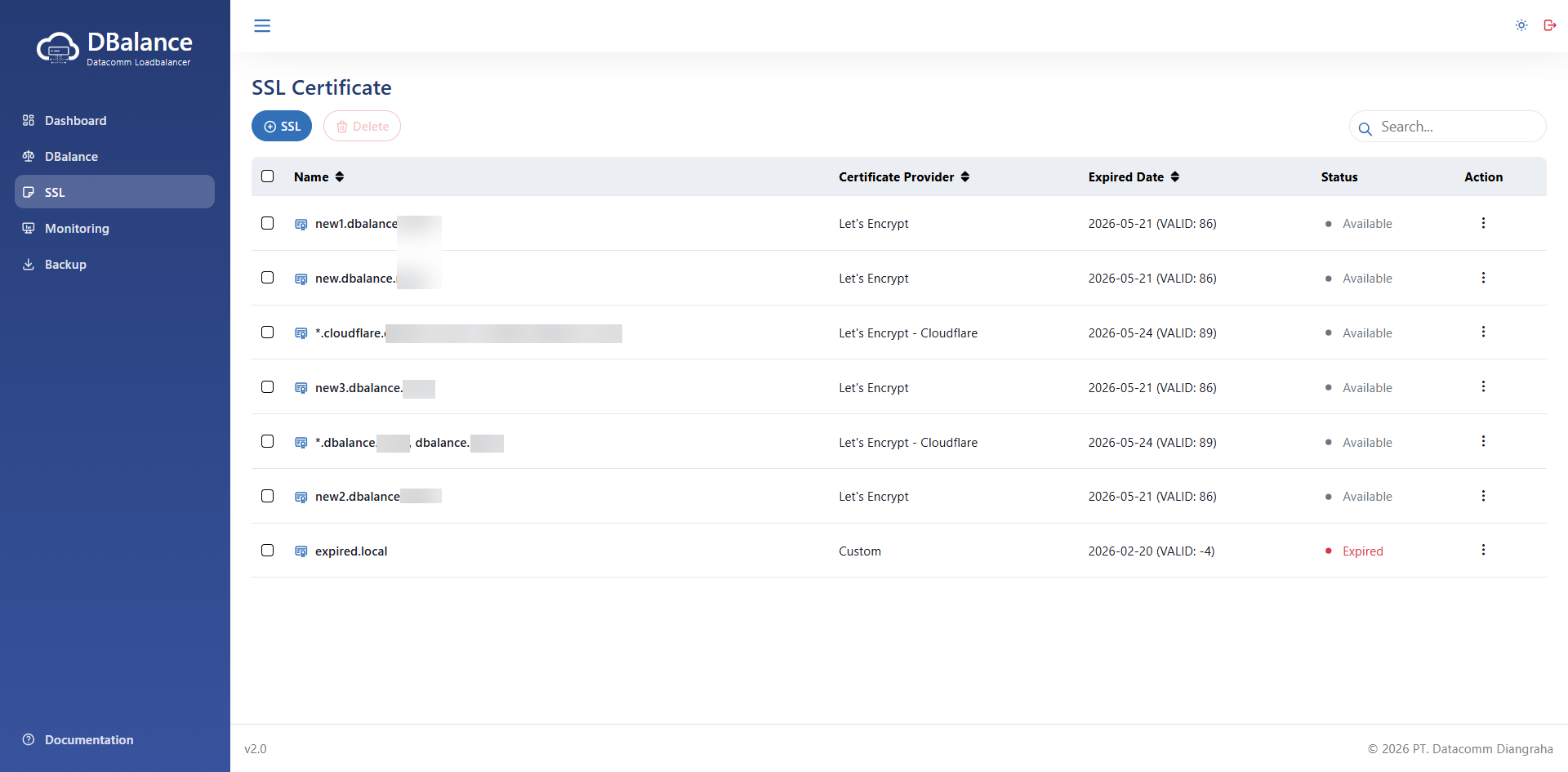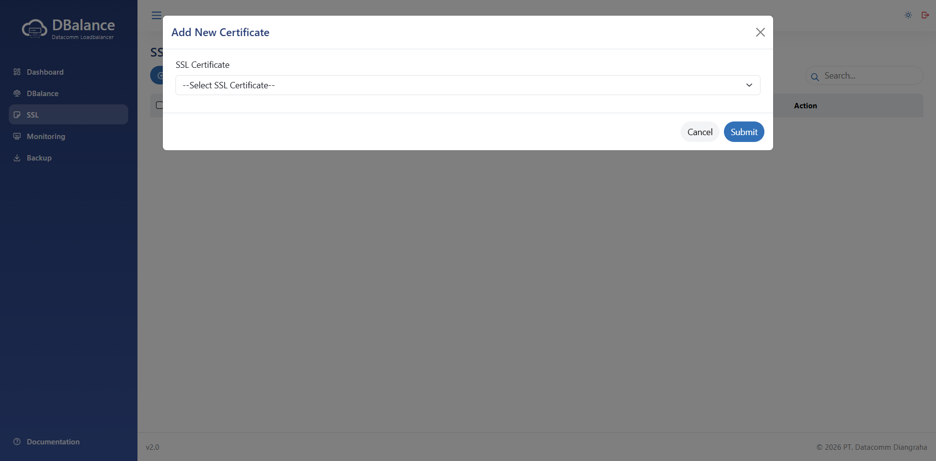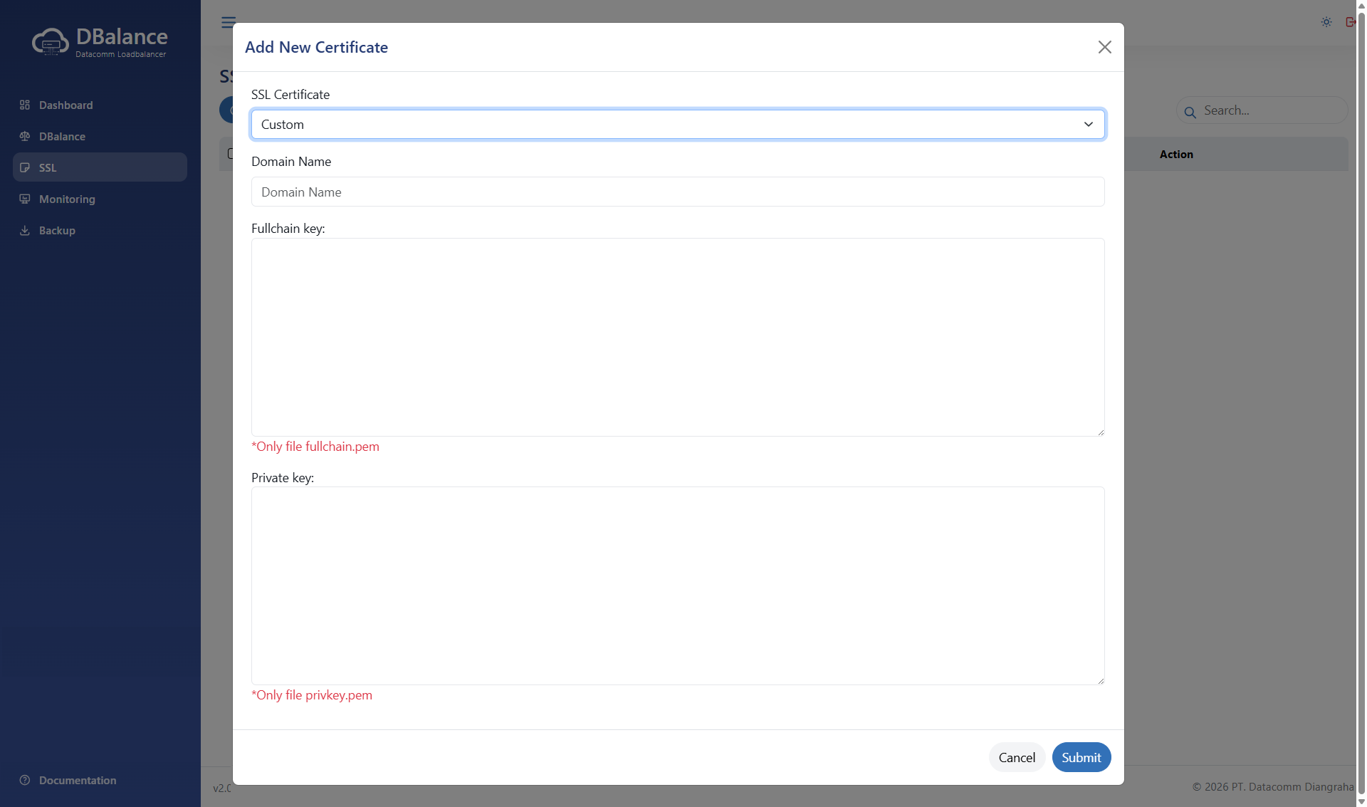 Gambar 3. Halaman Pilihan SSL Certificate Let’s Encrypt - Custom: Mengunggah sertifikat lengkap dan kunci privat yang sesuai (berformat .pem) untuk mengaktifkan koneksi SSL pada DBalance. Masukkan Domain Name, Fullchain Key, dan Private Key sesuai dengan sertifikat yang digunakan.