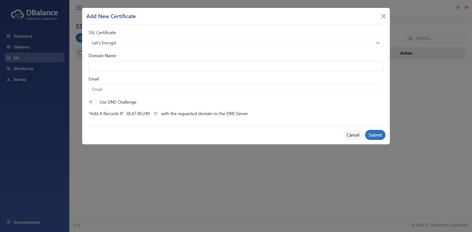 - Let’s Encrypt: DBalance akan otomatis mengelola pembuatan sertifikat SSL. Oleh karena itu, pastikan domain Anda telah aktif dan melakukan konfigurasi DNS Record Type A telah mengarah ke IP DBalance. Masukkan nama Domain Name dan Email yang terdaftar pada Let’s Encrypt.