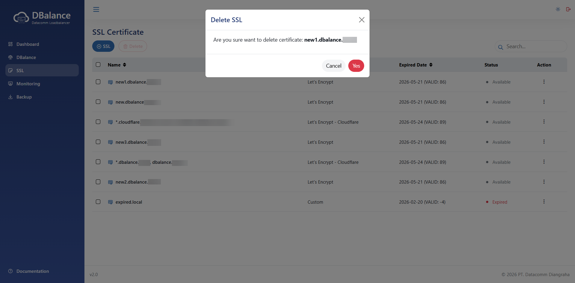 Gambar 2. Halaman Delete DBalance - Pengguna dapat menekan tombol Yes untuk menghapus DBalance. Atau tekan tombol Cancel apabila ingin membatalkan penghapusan dan kembali ke halaman sebelumnya.