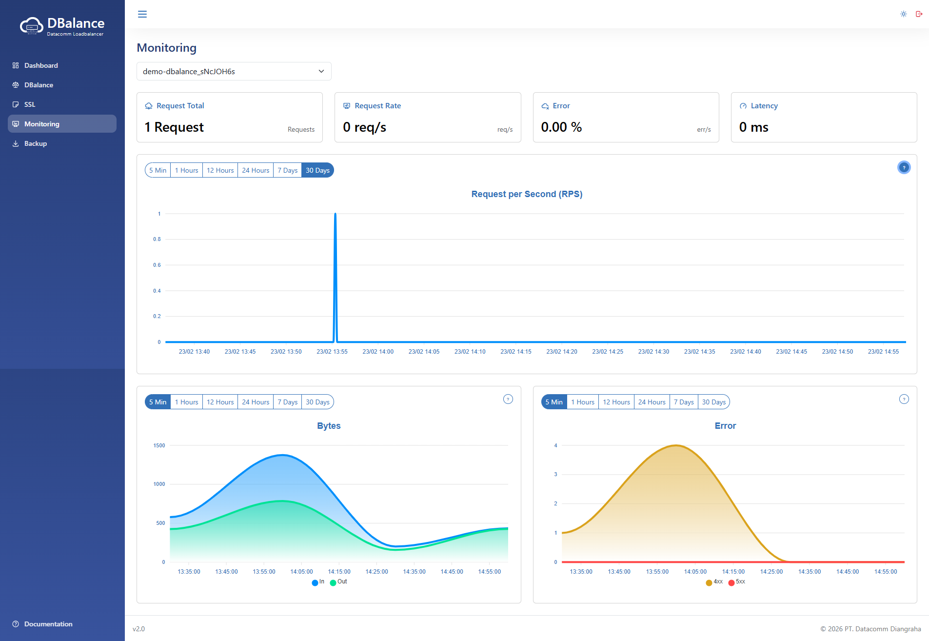 - Request Rate Menampilkan jumlah permintaan yang diproses oleh DBalance setiap detiknya. Metrik ini sangat berguna untuk memantau fluktuasi beban trafik secara instan.