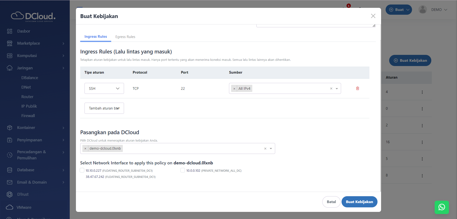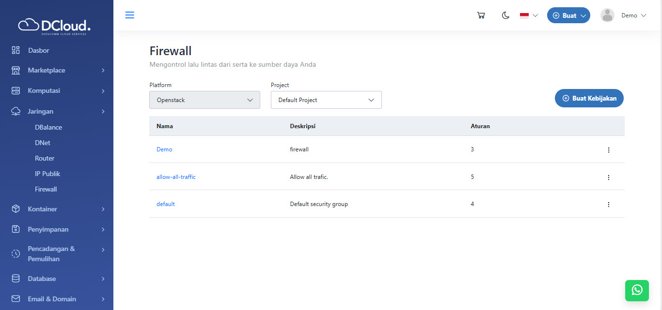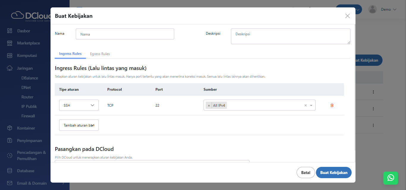 Menu Firewall berfungsi untuk mengelola lalu lintas data masuk (ingress) dan keluar (egress) dari DCloud melalui Kebijakan (Security Group).