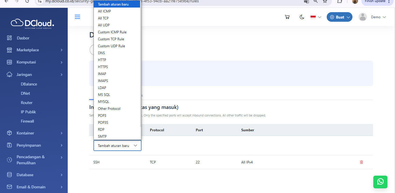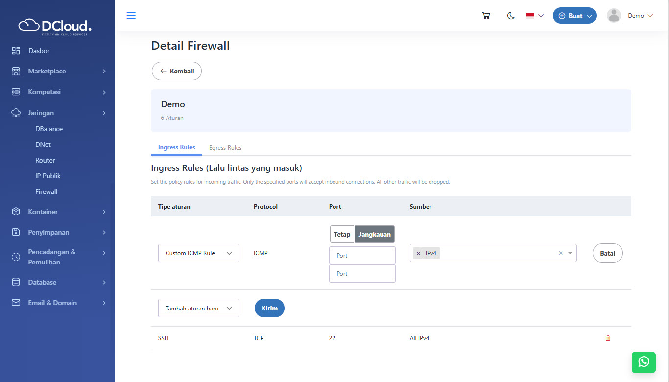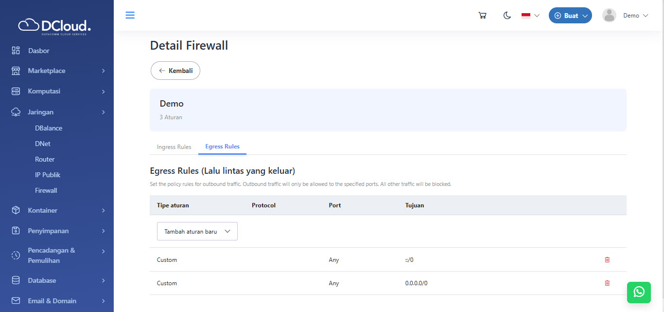 Hapus aturan digunakan untuk menghapus aturan firewall yang dimiliki. Untuk menghapus aturan, silakan lakukan langkah-langkah berikut:
