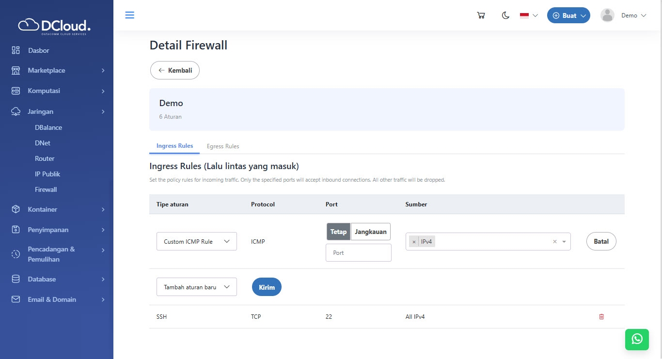 Hapus aturan digunakan untuk menghapus aturan firewall yang dimiliki. Untuk menghapus aturan, silakan lakukan langkah-langkah berikut: