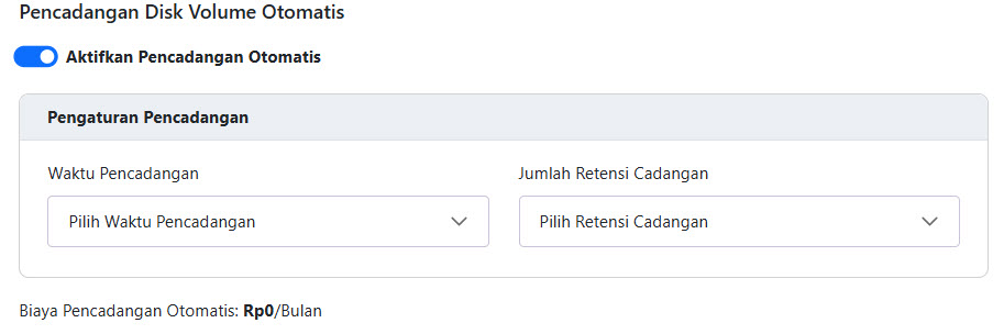 - Untuk mengaktifkan pencadangan otomatis pada volume, pilih opsi Aktifkan Pencadangan Otomatis. Lanjutkan dengan mengikuti langkah-langkah yang ada untuk menyelesaikan proses pencadangan. Jika tidak ingin menambahkan pencadangan, dapat menonaktifkan toggle tersebut.