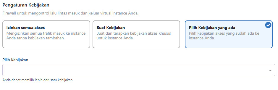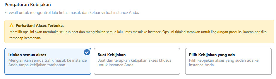 - Izinkan Semua Akses: Opsi ini akan membuka seluruh port dan mengizinkan semua lalu lintas masuk ke instance. Catatan: Opsi ini sangat tidak disarankan untuk lingkungan produksi karena mengekspos instance Anda terhadap risiko keamanan dari internet.