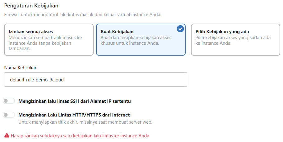 Halaman Tambah Jaringan - Pada tahap Pengaturan Kebijakan, Anda dapat menentukan konfigurasi firewall yang berfungsi mengontrol lalu lintas data (traffic) masuk dan keluar pada virtual instance Anda. DCloud menyediakan tiga pengaturan diantaranya: