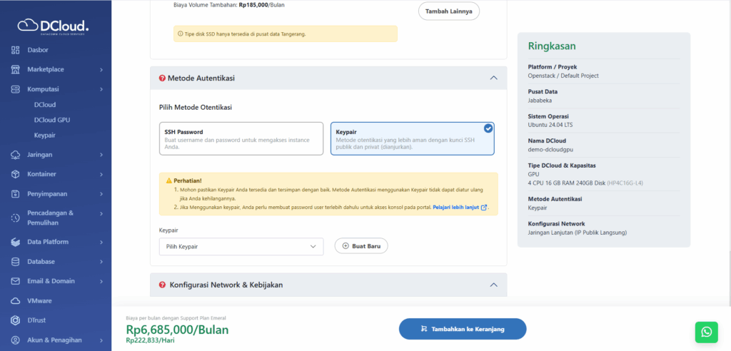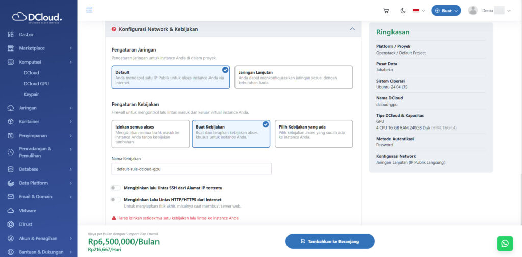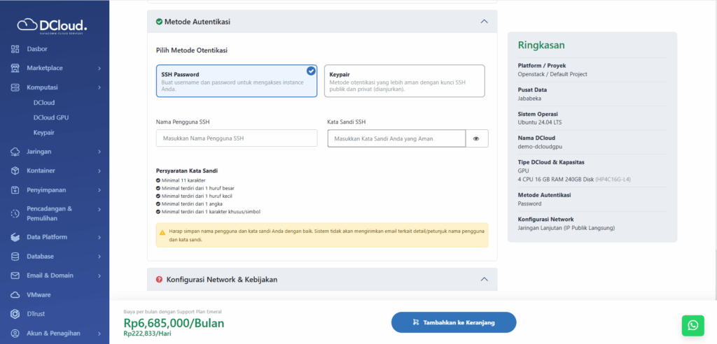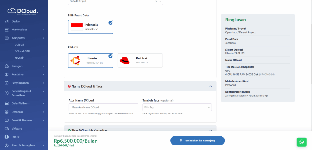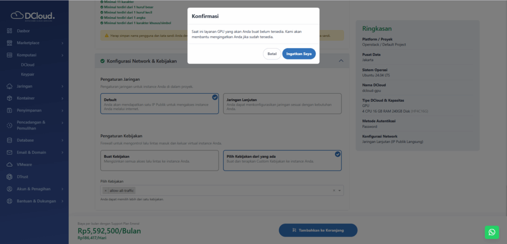 - Apabila data sudah terisi seluruhnya, pengguna dapat menekan tombol Tambahkan ke Keranjang. Sistem akan otomatis mengarahan pengguna ke halaman pembayaran jika layanan DCloud GPU tersedia.
