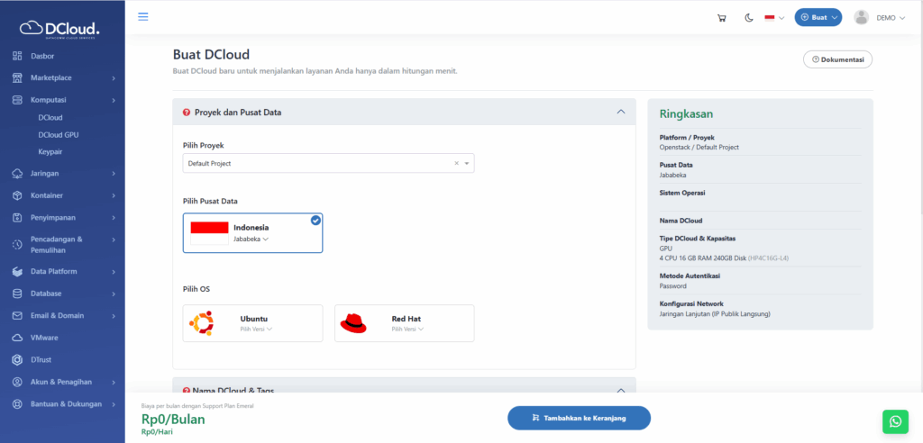 - Pada bagian Nama DCloud dan Tags, pengguna dapat mengisi data sesuai kebutuhan.