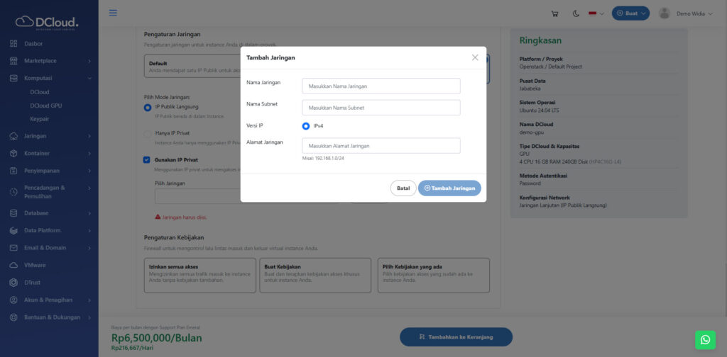 - Pilih mode jaringan Floating IP jika ingin instance mendapatkan satu IP Publik dan satu IP Private (ada biaya tambahan).