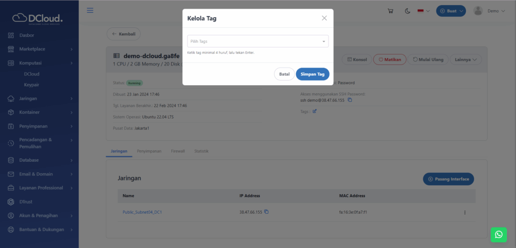 Halaman Detail DCloud Kelola Tags - Pilih tags yang akan digunakan atau masukkan tags baru sesuai keinginan.