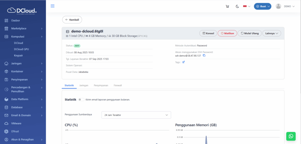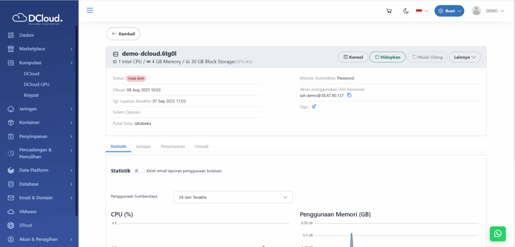 Halaman DCloud - Tekan tombol Lihat Detail, kemudian akan tampil detail layanan seperti gambar di bawah ini: