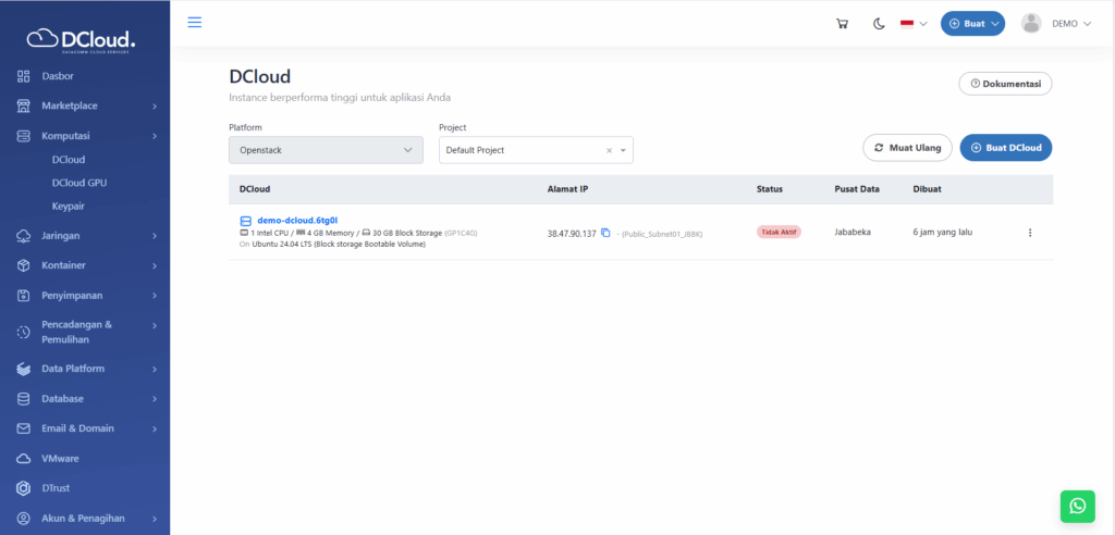 - Setelah dimatikan, status layanan DCloud akan berubah dari Aktif menjadi Tidak Aktif seperti tampilan di bawah ini:
