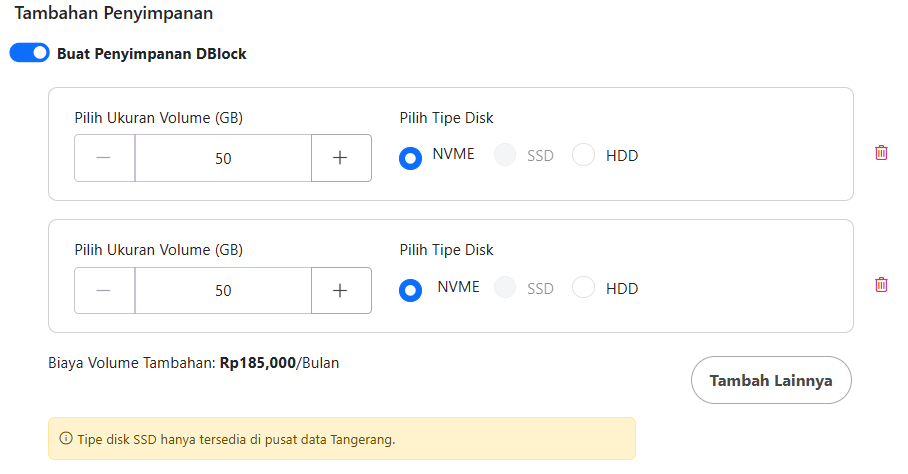 - Pengguna dapat menambahkan hingga 10 DBlock untuk kapasitas penyimpanan yang lebih besar dengan menekan tombol Tambah Lainnya.